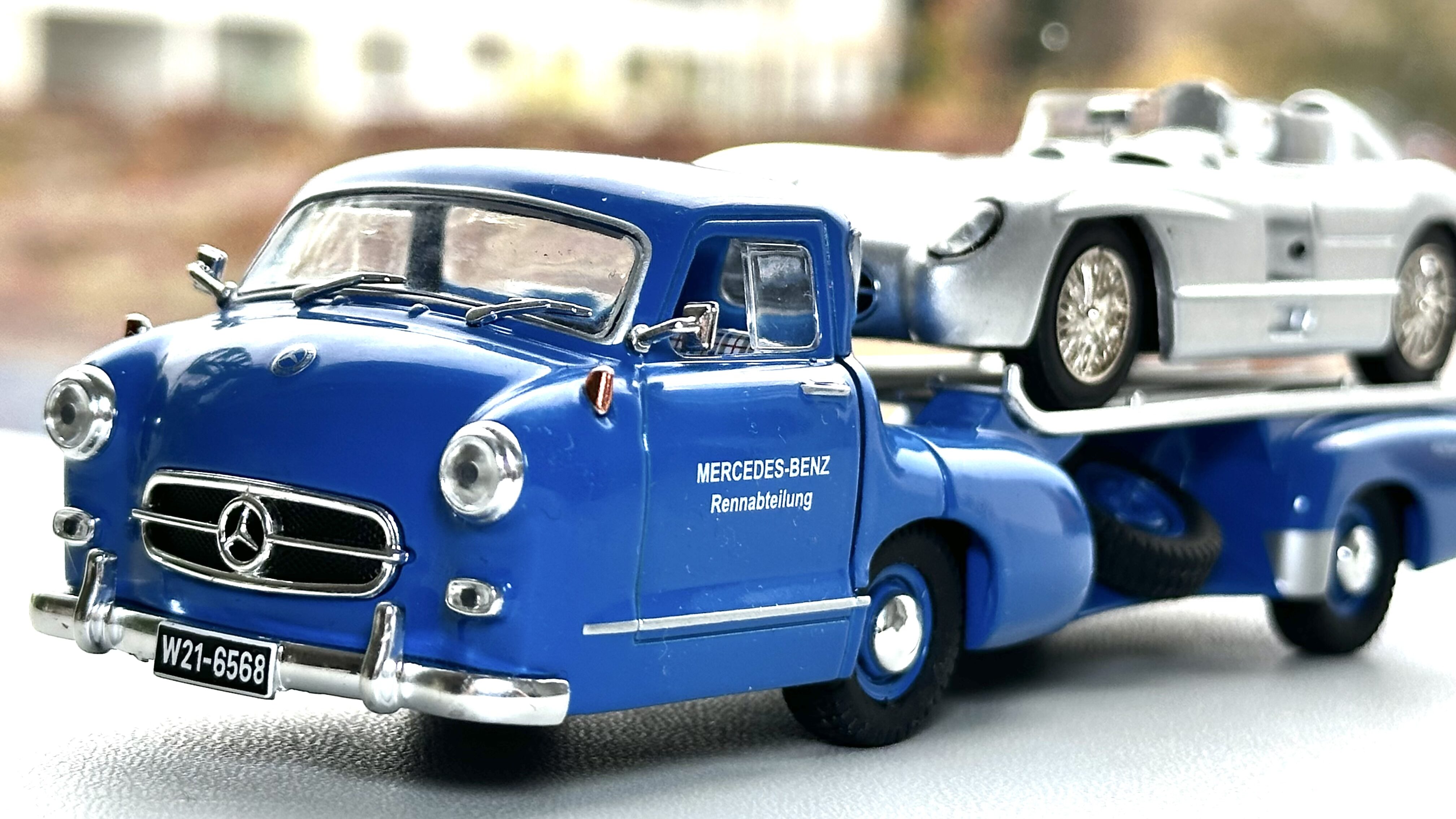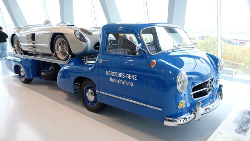 二年前にシュツットガルトのメルセデス・ベンツ博物館を訪れたときに、その衝撃的に青く美しいボディワークを一目見て参ってしまったのがコレ。メルセデスの歴史的なスポーツカー、300SLRを積んだトランスポーターなのだが当時の技術の粋を集めて作られており、なんと1955年で時速170km/hで走るというとんでもない高速トランスポーターである。その名も “Blue Wonder” (ドイツ語だと Blaues Wunder)。ボディは通常の車両輸送車に見られるキャビンとエンジンの前部と後部のトレーラーに別れておらず一体構造となっている。高速からの停止用にエアブレーキまで装備されていたという。いや、そんな機械的な性能はともかく、この優美なスタイルと美しい仕上げは時を超えて永遠に評価されるべきであろう。