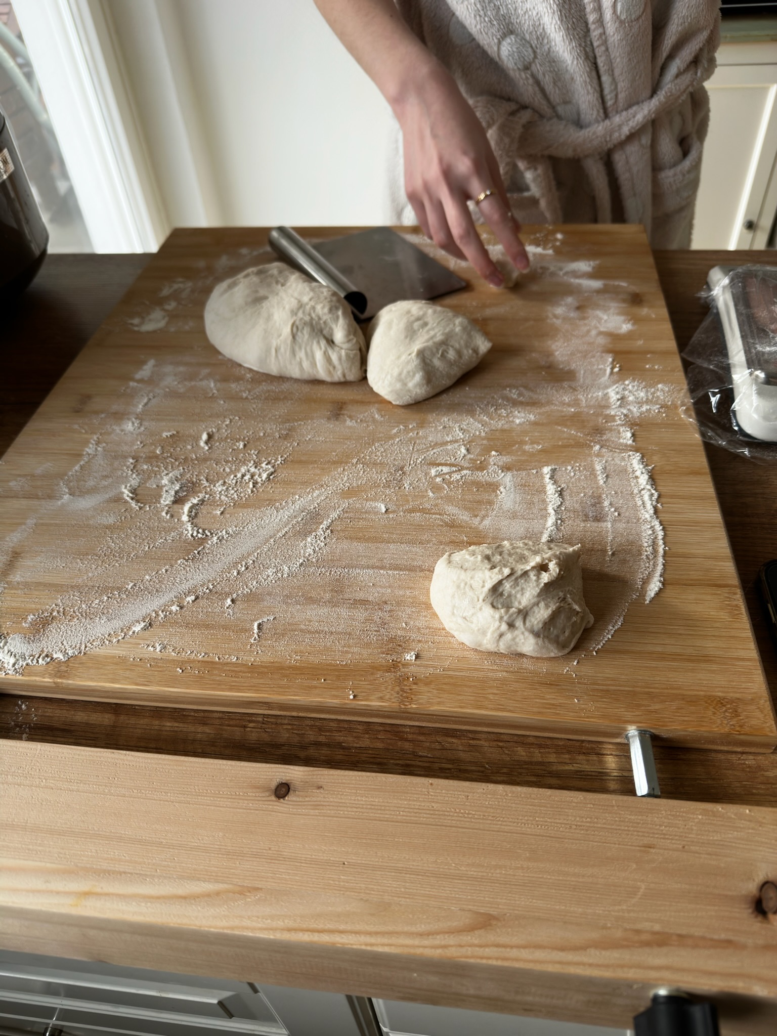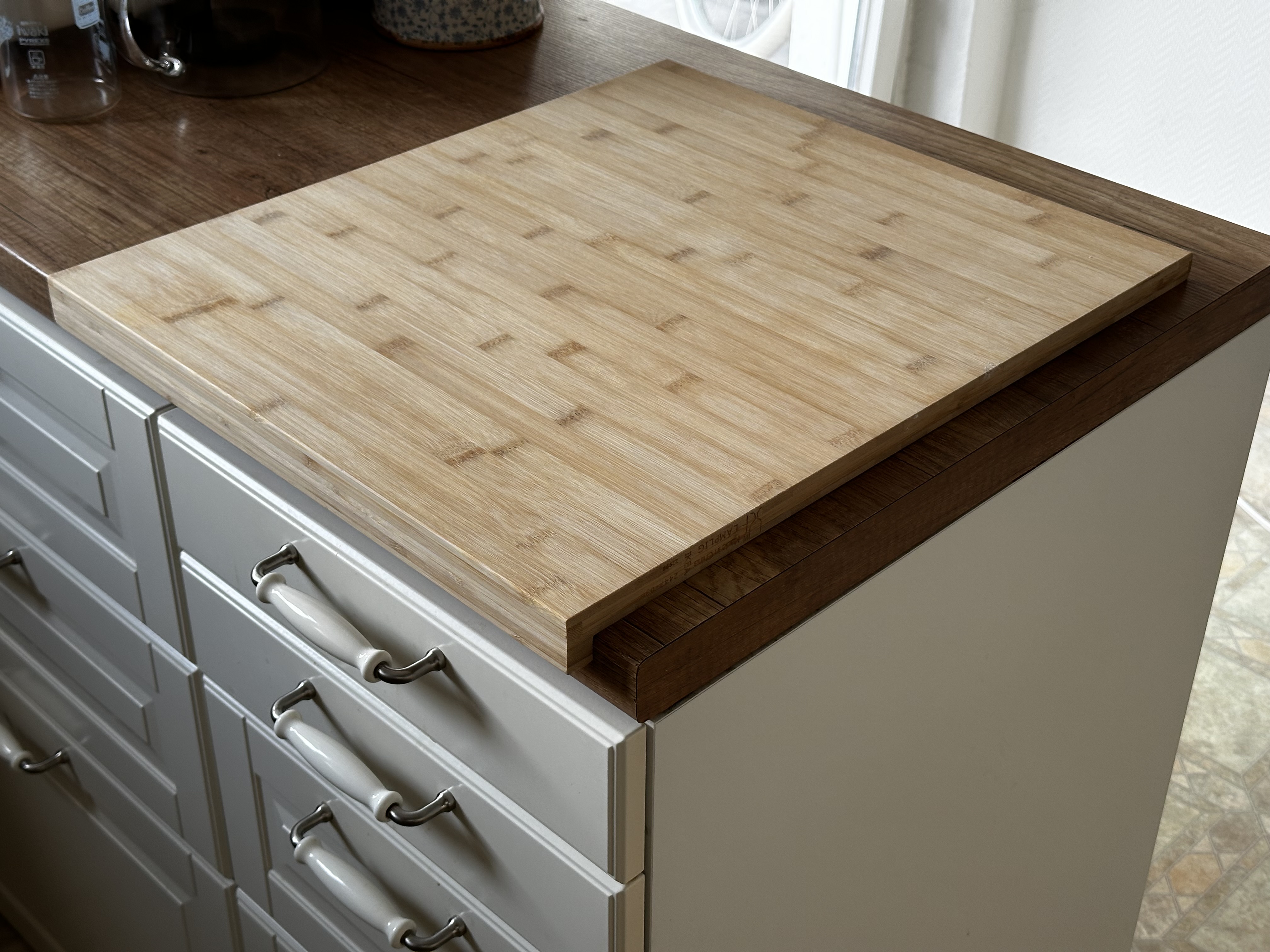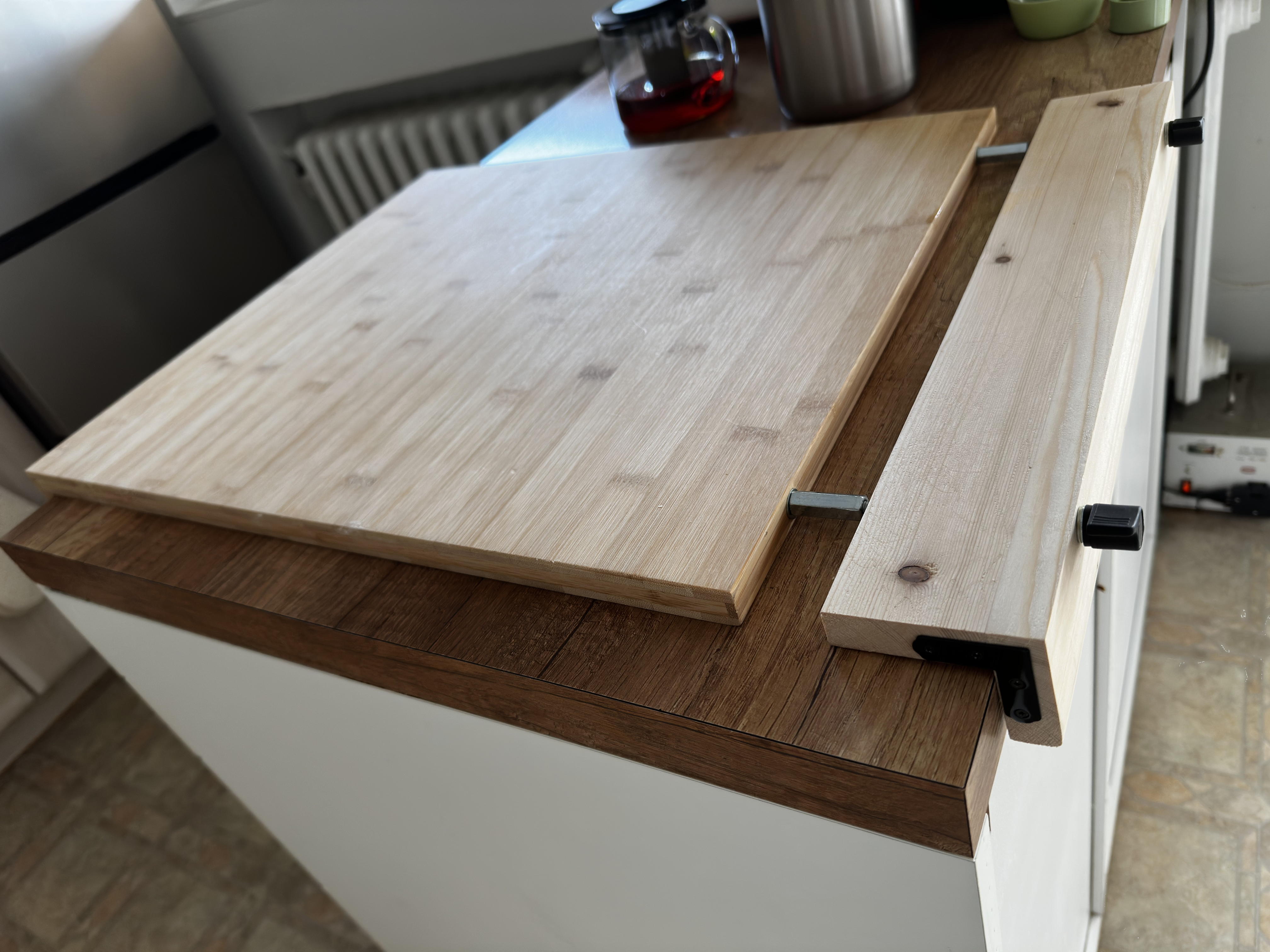 毎週パンを焼く妻がIKEAの巨大まな板というかパンこね用の板?を買ったのだが、台所の作業台の上でスルスル滑って動いてしまって落ち着かない。一応手前に引っ掛ける部分があるものの、これだけでは安定しないらしい。ノンスリップマットみたいなのを下に敷いてみたけど力を入れて捏ねているとズルズル動いてしまう。ここは親父の出番、と固定できる仕組みをでっち上げてみた。
