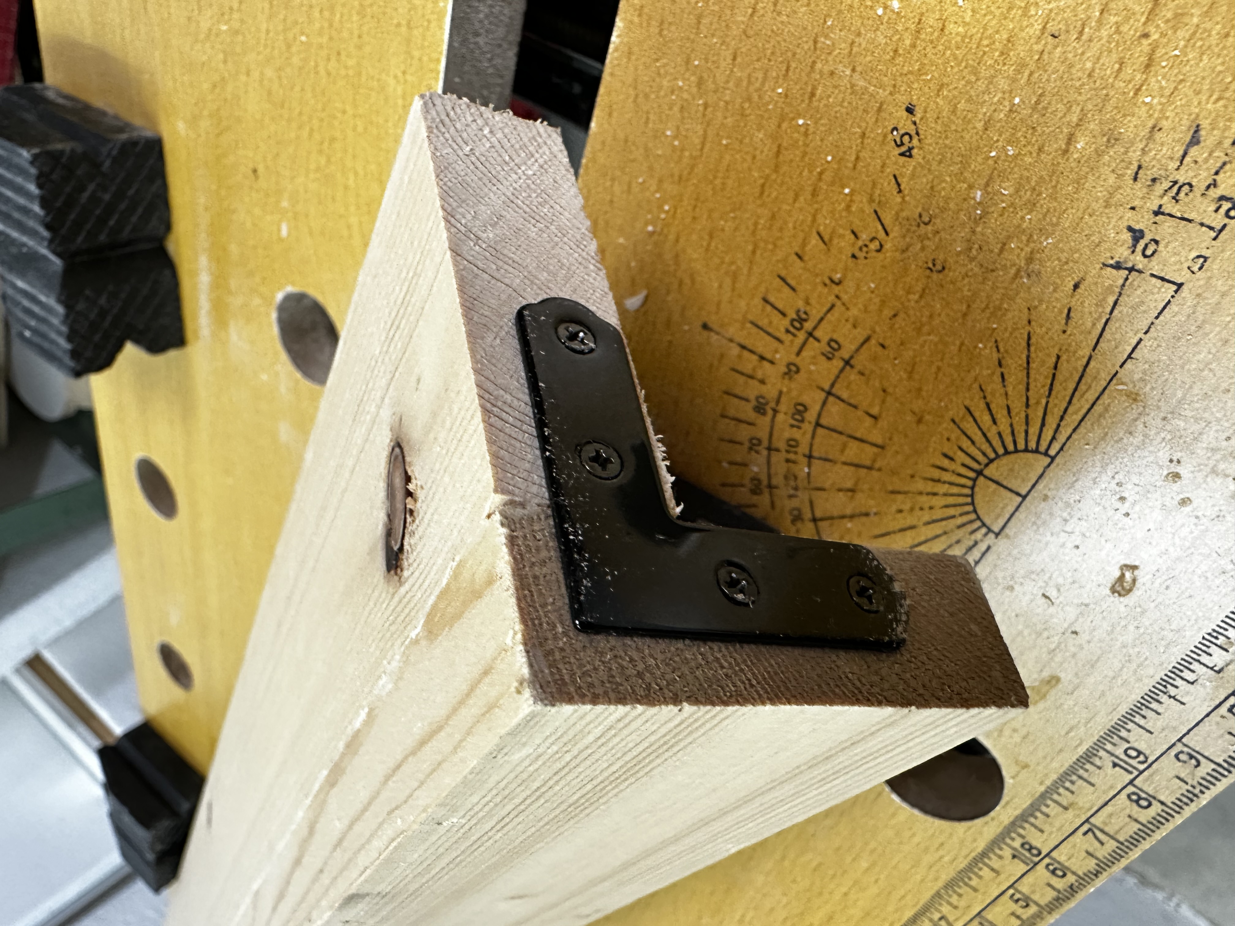 以下に作業中の写真を示す。材料は何かに使った残りの端材がちょうどまな板と同じ厚さだったのでこの機会に使うことに。フシ穴が酷くて目につくところには使えないので放ってあったもの。表面も汚れていたのをサンダーで削って綺麗にした後、二つに切って直角にボンドで貼り合わせ。机に引っ掛ける力を受けるところなので、鉄のアングル補強材も両端に付ける。