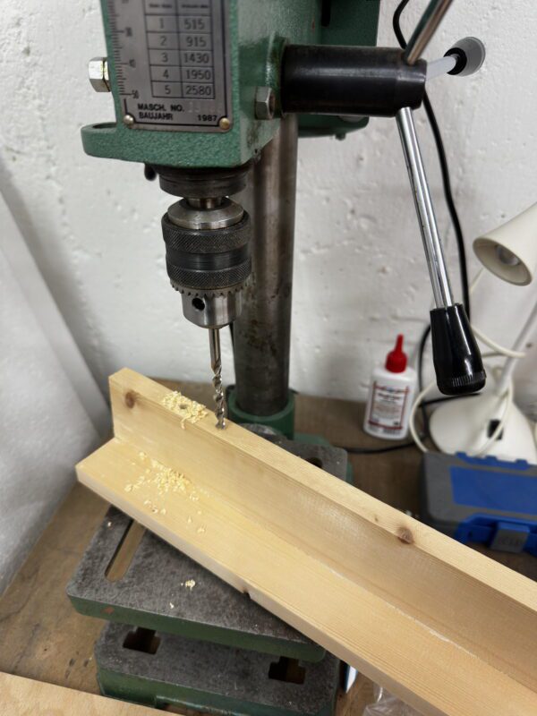 直角に固定出来たら、ネジ付き棒が貫通できるよう穴を開ける。こういうときのためのボール盤が活躍。長いドリルを買うべきだがケチなので両側から出来るだけ位置を合わせて穴を開けて済ませる。