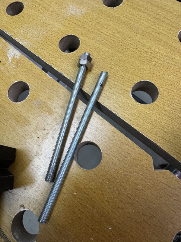 このネジ付き棒の上をL型の部品がスライドし、端のつまみ付きナットで締め込む設計。長さが結構シビアなのと、長いボルトというのは高価なので、安いM6の全ネジの鉄棒を買って切って使う。ネジを切るときにクランプ出来るよう、ナットを二個締め込んでそこを挟んで作業出来るようにした。こうやってナットを先に噛ませておいて金属用ノコギリで切った後に回して抜くことで、潰れたネジ山を内側から矯正出来る、と昔教わった。