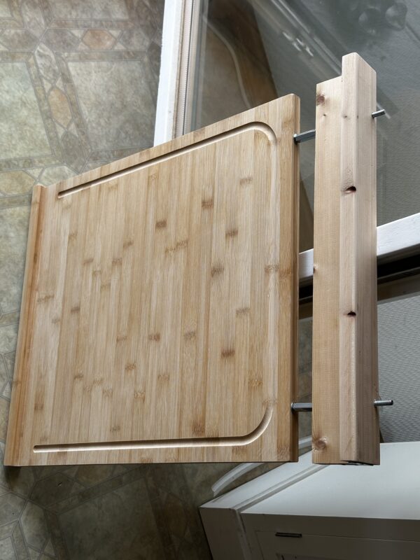 こちらが完成品。下向きの突起を付けたL型部品がまな板からネジで伸びており、作業台の奥側にも引っ掛けて更にネジで締め付けて固定出来るようにした。