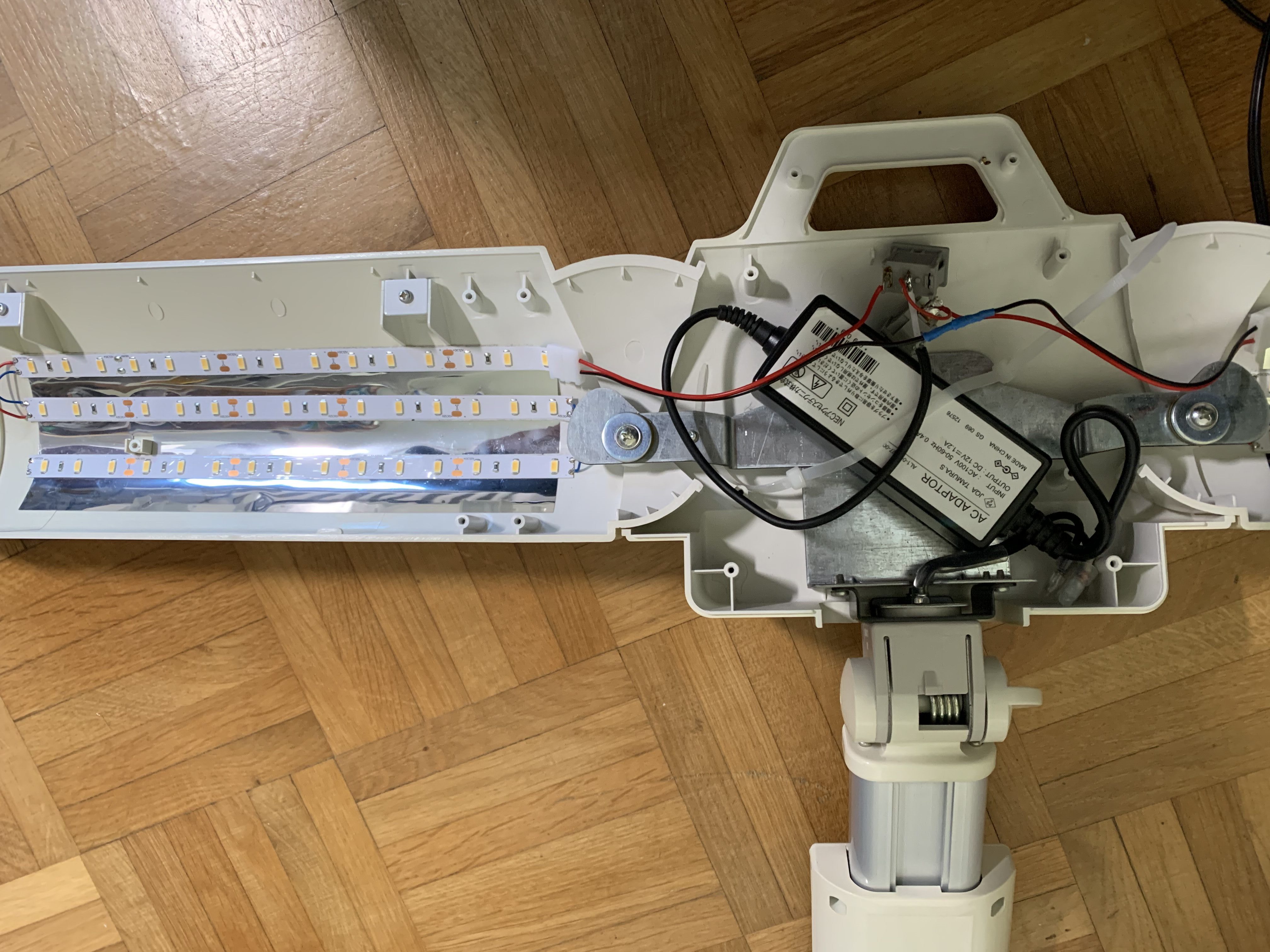 LEDストリップは放熱のために金属板に貼って内蔵すべき。蛍光灯用のペラッペラの反射板があるにはあるがちょっと小さい。放熱板が無くて温度が上がるとLEDの寿命に影響あるのだが、もう家で学習机に長時間向かって座ることもないということだし、この可愛らしい机をこの先10年も使うことも無かろうから目をつぶって1本は樹脂ハウジングに直接貼っている。NECのワイヤレスルーターの12V電源アダプタがあつらえた様にぴったり収まった。100V用表記だがスイッチング電源なので汎用、ドイツの240Vでも平気。スイッチは元のを生かして左右別々に点灯出来る。