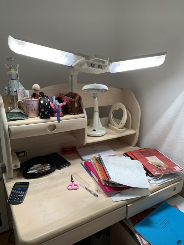日本から持参した長女の学習机、丸っこいデザインやらハートマークの取っ手やら可愛くて気に入っているのだが何せ15年近く前のモデルなので照明が蛍光灯。ドイツで変圧器を通して100Vにして使っていたところが、寿命か変圧器の出力に難があったか分からないが遂にインバータから煙を吹いて壊れてしまった。修理する意味も無いので蛍光灯を取っ払ってLEDに交換することに。手持ちの高演色性LEDストリップをぺたぺた貼って適当な12Vのアダプタを詰め込んで完了。