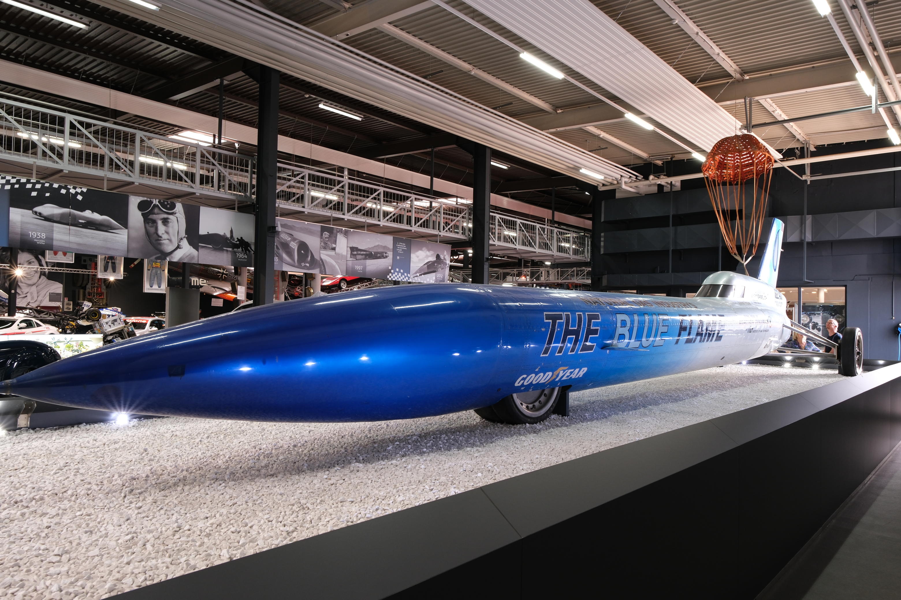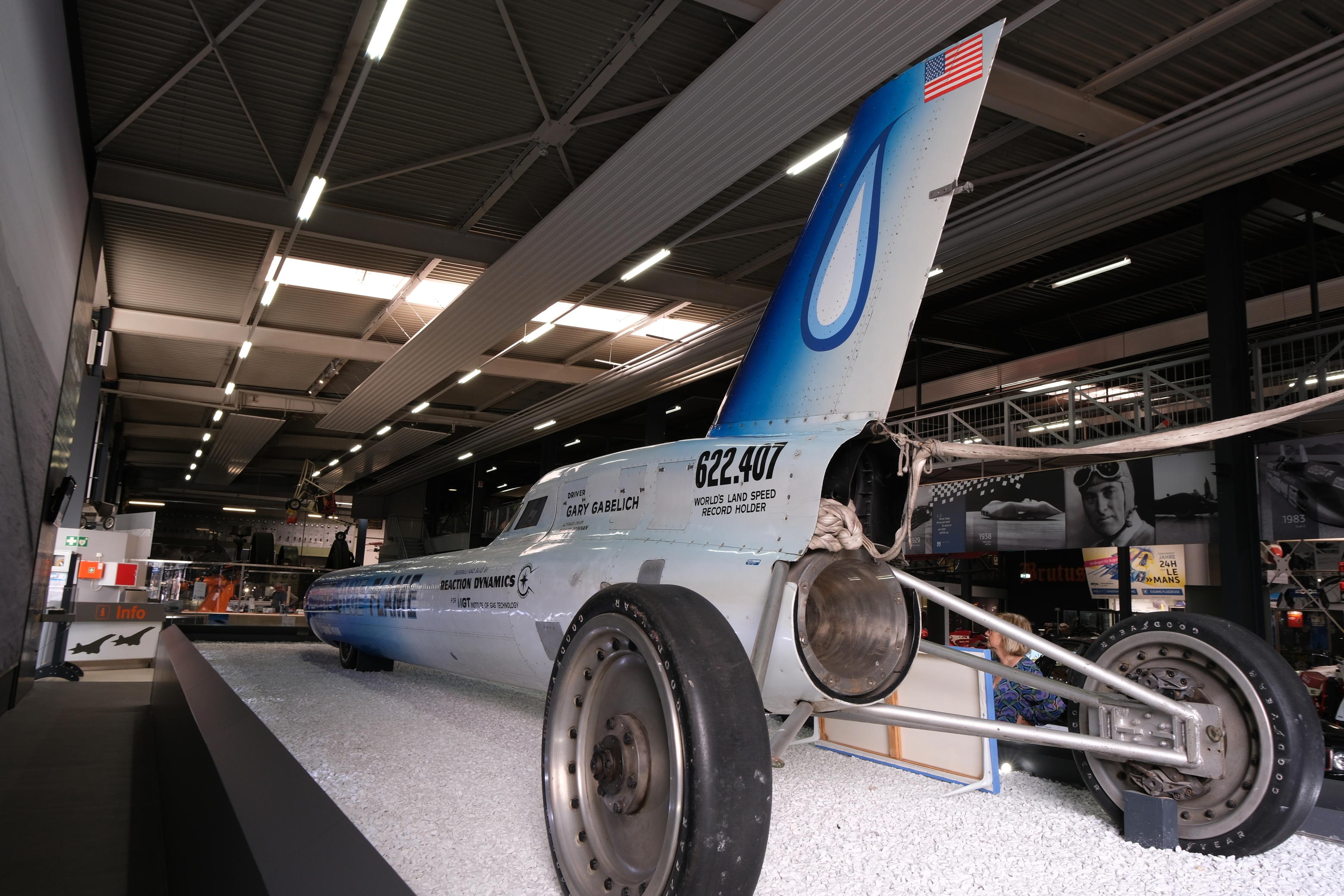 車体に書かれている622mphの記録は最速区間1マイルの平均速度で、手前のパネルに書かれている630mphはその後半の1kmの平均速度、ということのようです。1970年10月23日にユタ州のボンネビル乾塩湖で達成しました。ピーク速度は約650mphでした。