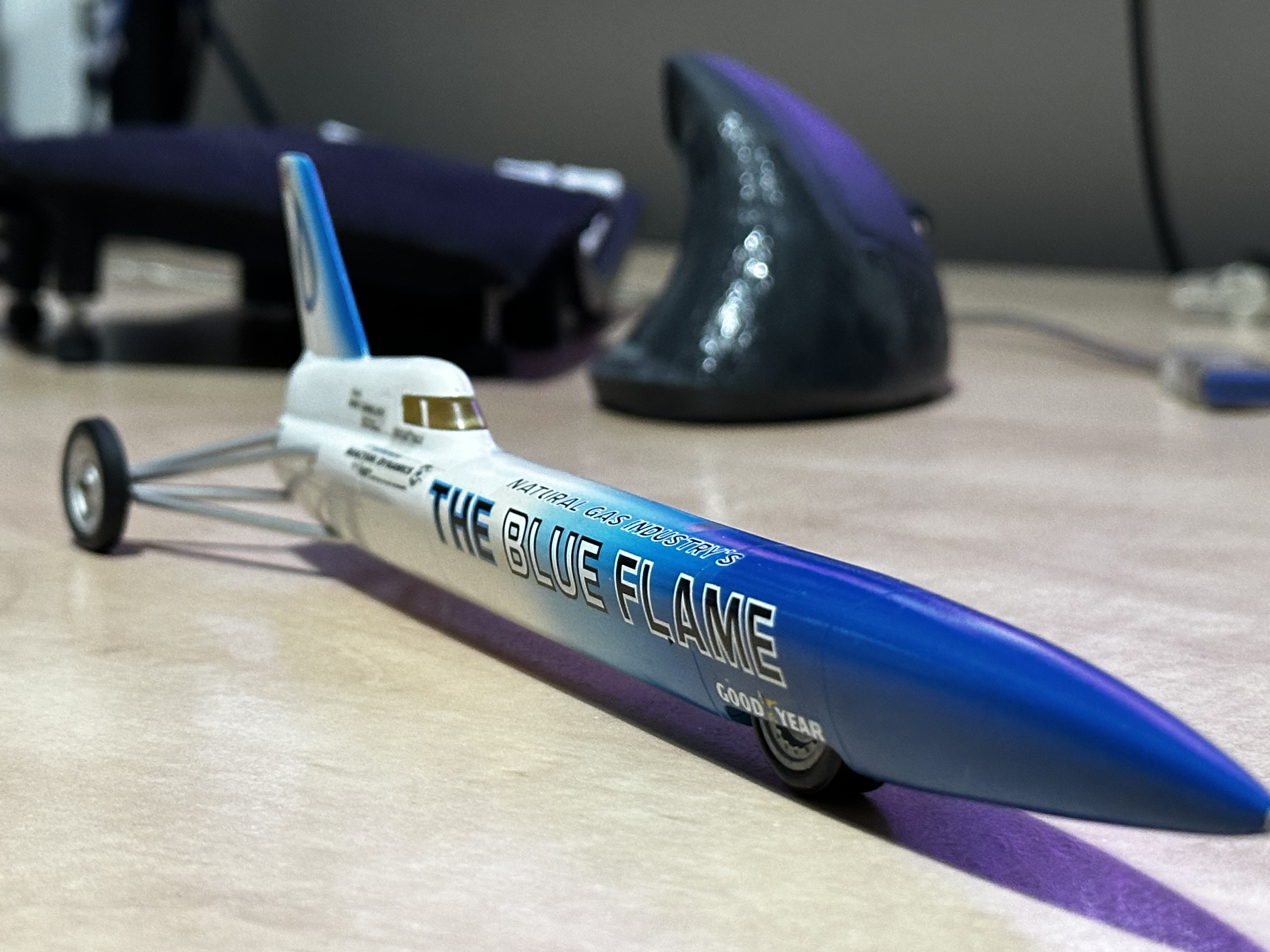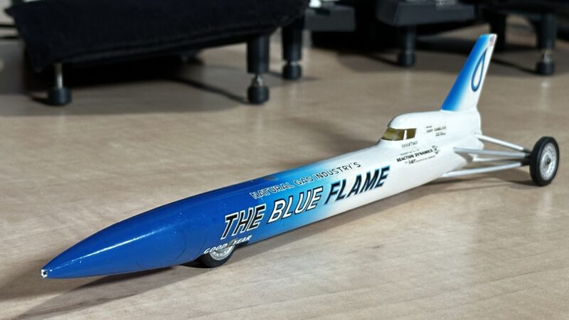 我々の世代には子供時代に世界最速の車というと長らくこれでしたね、1970-1983の記録保持車、時速1002kmのブルーフレイム号です。石油ストーブではありません。憧れの車両の模型をやっと手に入れました。
