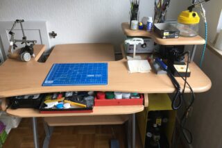 古いパソコンデスクを改造して作業机に使っていたが、何にでも中途半端に手を出しては完成させられない性格の為どうにも手狭でにっちもさっちもいかなくなってきた。遂には組みかけのアンプの上に板を置いてその上で模型を作る有様(これはこれで高さが稼げて精密作業には丁度良かったりもするのだが)。モニタ台に塗装ブースを置くというアイデアが気に入っていたが路線変更を画策。
