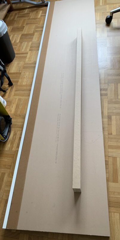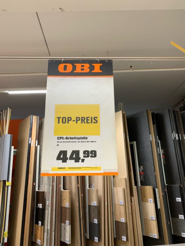 もっと安く上げたいな!と言う事で春頃からホムセンの半端板材値引きコーナーを定期巡回していたところ2.2m長の38mm厚パーティクルボードのビニールシート、白天板が70EURになっていたのを見つけて即買い。