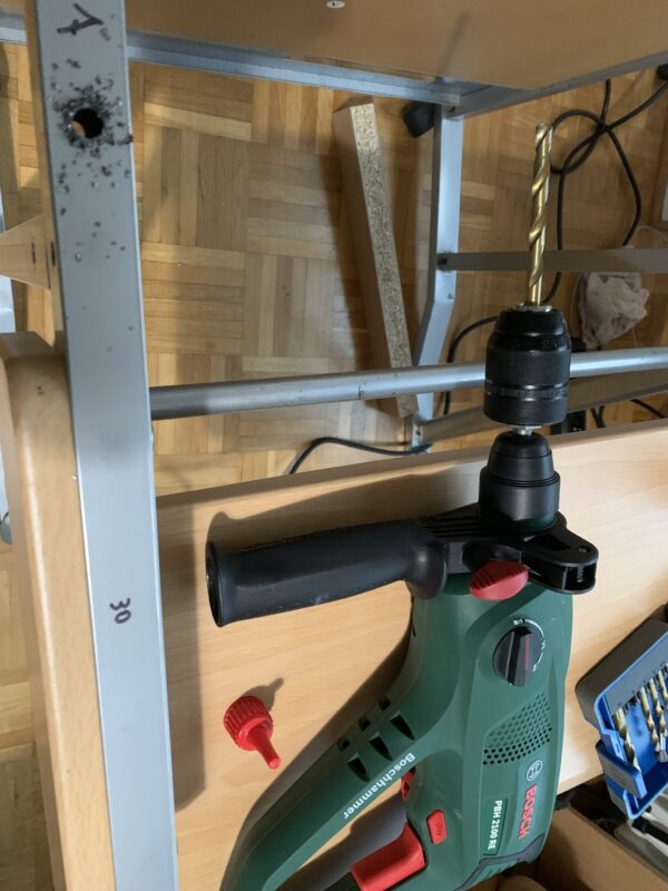 パソコンデスクの木目天板を外してドリルで鉄フレームに穴開けし、新しい天板が載せられるように加工する。ハンマードリルのSDS+ジョイントに普通のドリルを刺せるアダプターが大活躍。馬力があるから鉄フレームでもバリバリ穴が開く。こんなの地下室のボール盤に乗せられないし。