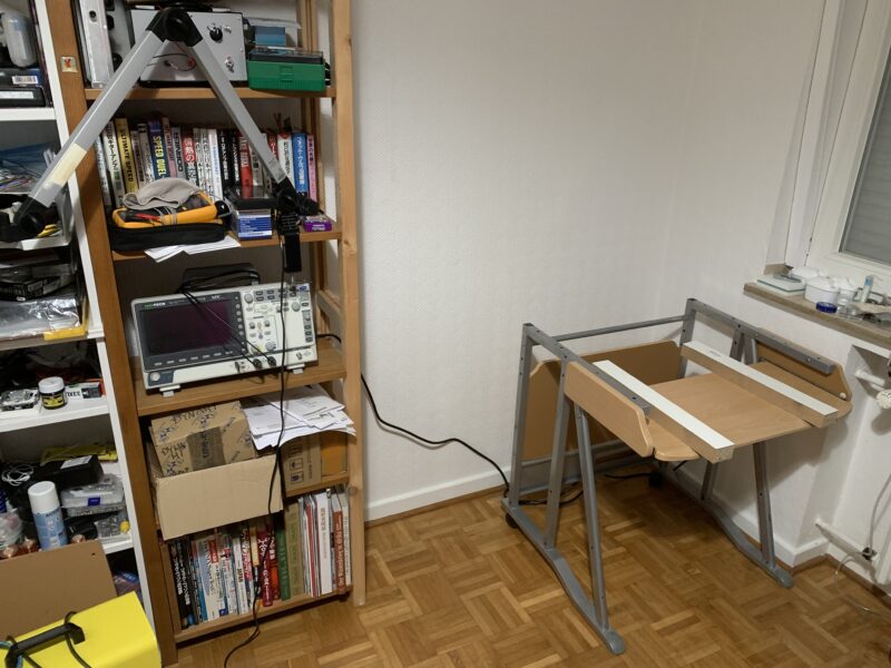 右奥隅には棚の奥行き分だけ38mm厚の天板の半端な奴を買って白く塗って繋げる。前の棚は自分のLUNDIAの本棚と長女の断捨離で余ったIKEAの白いのが奥行き30cmで揃うので並べる。仕事机との間が狭くなっちゃったけど、作業台の奥行きを50cmに抑えたし、ギリなんとか。この機会に足元は部屋中前面に白いビニールシートを敷いて落ちた部品等が見つけやすいようにしたら効果抜群!ホコリでも髪の毛でも気になって気が狂いそうになって一日二回は掃除機を掛ける羽目に(笑)。まあどんなに机を広くしてもそれだけ物を広げてしまって空きスペースなんてなくなるんですけどね。