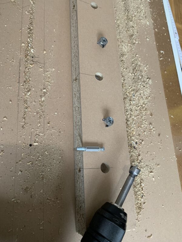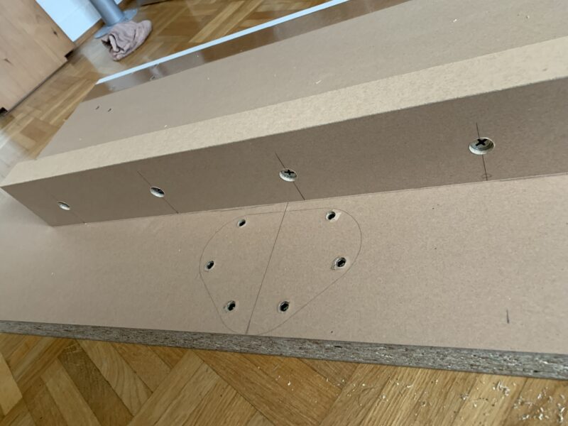 奥行きは60cmも要らない(理由は後述)ので長手方向に幅で10cm程切ってもらって裏に補強材として取り付け。こういうときはIKEAの余った部品が役に立つ。IKEAによくある巻き込んで締め上げるタイプの固定具(名前はあるのか?)用に16mm径の穴開け工具が必要でこれは新規に購入。天板の奥行きを詰めた奴を裏側に立てる。厚さは38mmもあるけどパーティクルボードなので剛性は無い。普通は金属のフレームに載せて使う為の天板を足だけで支えて使うので補強材を入れてみたけど、まだちょっと不安。