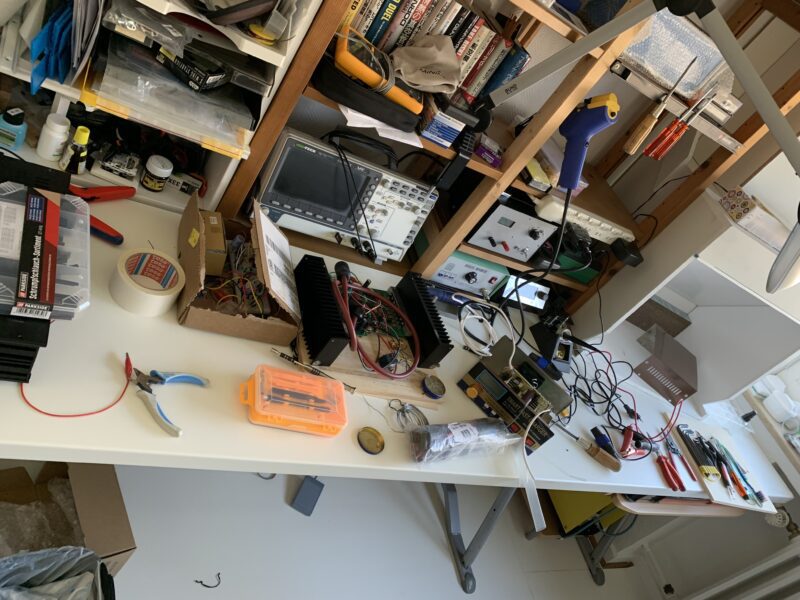 前の棚に測定器や半田ゴテを突っ込んだので奥行き50cmでも天板は全部使えるので充分快適。100, 120, 240Vのテーブルタップを並べて何でも直ぐに刺せる様にした。よく使う工具を磁石で吊してすぐ取れるのは超便利。と言ってる内に作業中のユニットの横に新しいプロジェクト(バッテリー充電器への電源スイッチ追加)でお店を広げちゃってスペースはあればあるだけ使っちゃうの図。