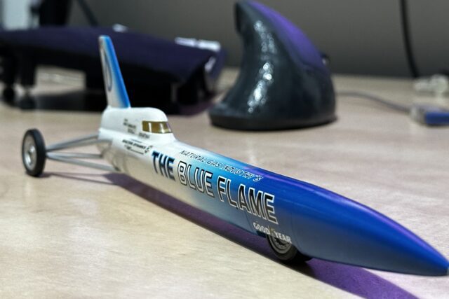 モータースポーツ 速度記録車 時速1002km、ブルーフレイム号 1/43 ミニカー 1970-1983の速度世界記録保持車、時速1002kmのブルーフレイム号の模型を手に入れました。先端ピトー管が破損していたので修復。全体の雰囲気は結構良い出来ですがコクピットが高すぎるかな。 2025.11.23 モータースポーツ模型